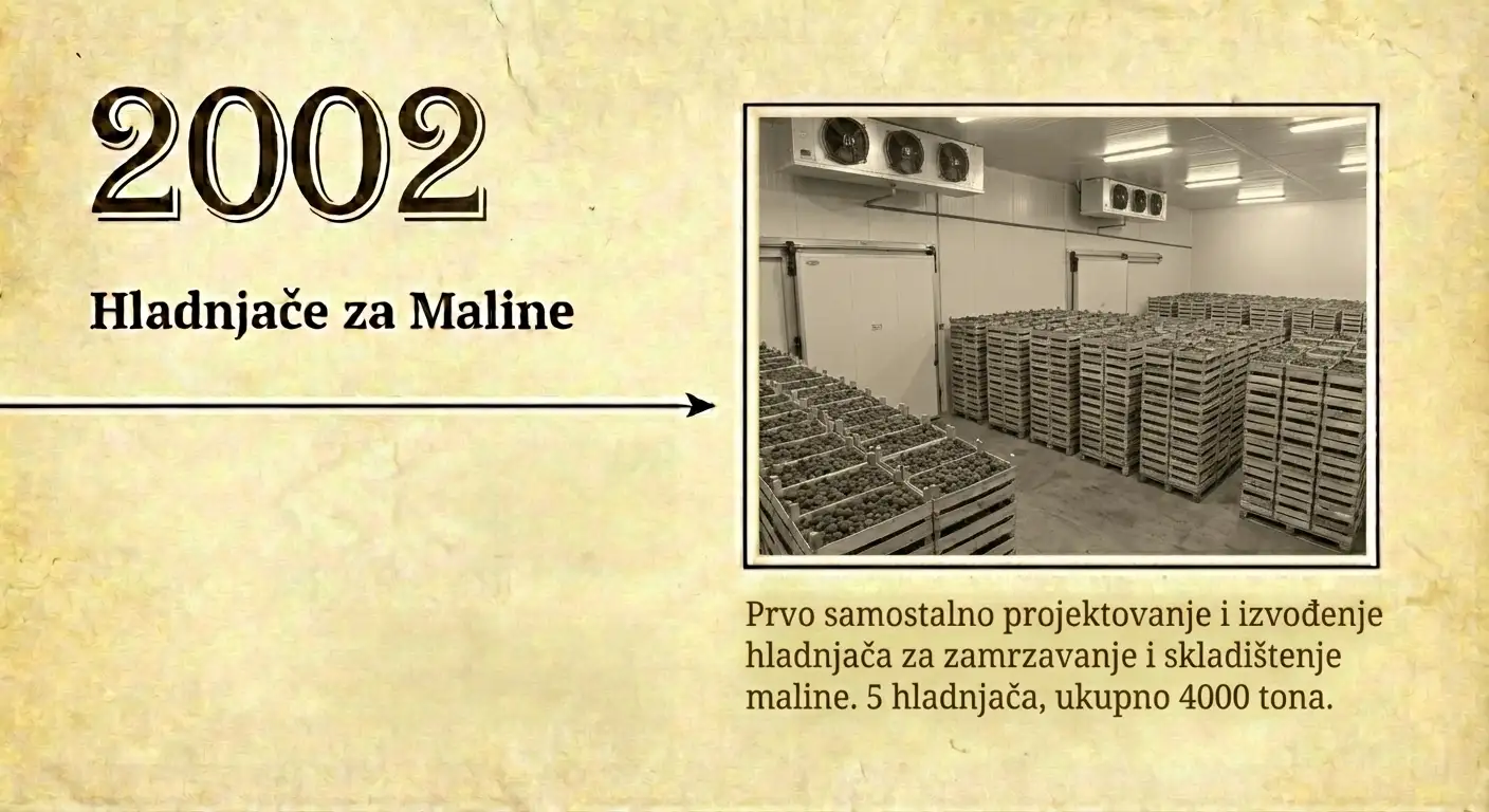 Prvo samostalno projektovanje i izvođenje hladnjača za zamrzavanje i skladištenje maline. 5 hladnjača, ukupno 4000 tona.