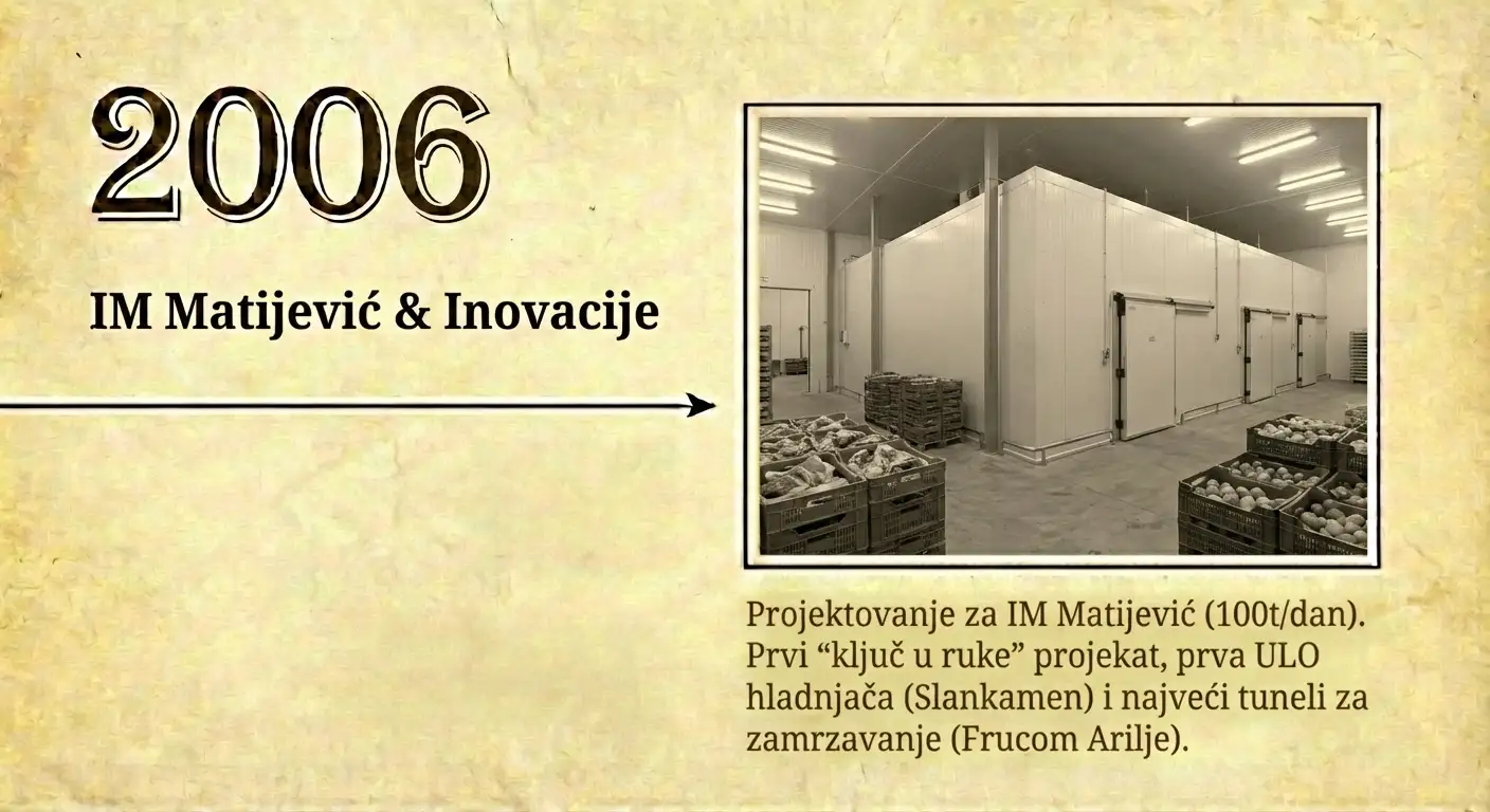 Projektovanje za IM Matijević (100t/dan). Prvi 'ključ u ruke' projekat, prva ULO hladnjača (Slankamen) i najveći tuneli za zamrzavanje (Frucom Arilje).