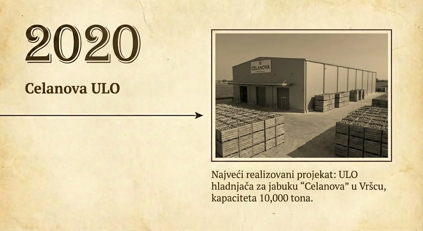 Najveći realizovani projekat: ULO hladnjača za jabuku 'Celanova' u Vršcu, kapaciteta 10,000 tona.